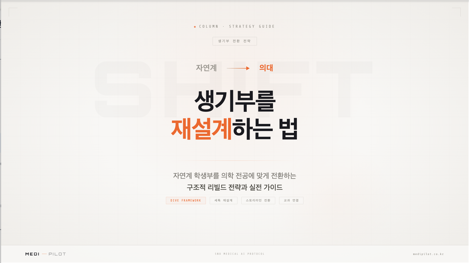 자연계에서 의대로 전환한 합격생들의 생기부 재설계 4단계. 기존 활동을 버리지 않고 의학 맥락으로 재해석하는 DIVE 프레임워크.